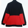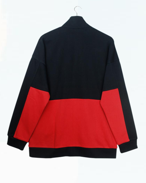 Contrast color blocking at the back of the garment.